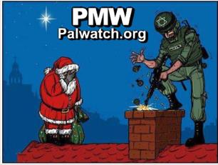 The cartoon shows an Israeli soldier with a Star of David on his helmet throwing hand grenades and firing his assault rifle down a chimney while Santa Claus stands to the side, covering his eyes. A church can be seen in the background, and a star, apparently "the Star of Bethlehem," shines brightly in the sky.