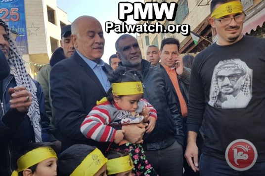 | Fatah Central Committee Deputy Secretary and Head of the Supreme Council for Sport and Youth Affairs Jibril Rajoub holds child at the parade. |
