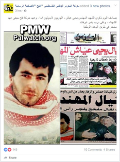 Posted text: “Today is the anniversary of [the death of] Martyr (Shahid) engineer Yahya Ayyash (i.e., Hamas terrorist bomb-maker). The revolutionaries never die, and the path of the Fatah Movement will remain the path of the Martyrs and the path of Yasser Arafat.
