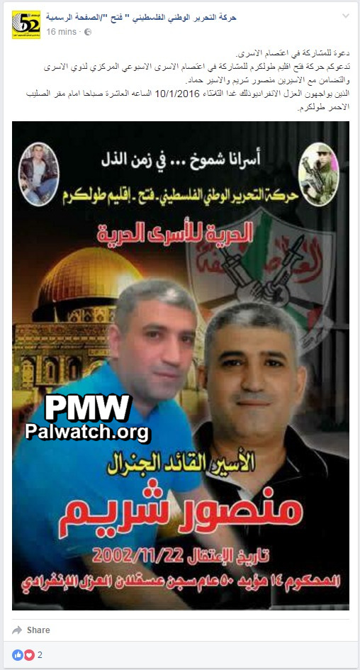 The Tulkarem branch of the Fatah Movement calls on you to participate tomorrow, Tuesday, Jan. 10, 2016 (sic., 2017), at 10:00 a.m. in the weekly central sit-in strike of the prisoners’ relatives in front of the Red Cross headquarters in Tulkarem, as a sign of solidarity with prisoners Mansour Shreim (i.e., terrorist, responsible for the murder of 11) and [Thaer] Hammad (i.e., terrorist, murdered 10) who are in isolation.”