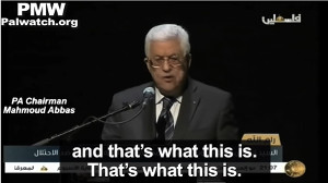 By actively and vociferously condemning terror in all other parts of the world and refusing to condemn Palestinian terror against Israelis, Abbas is notifying his people that he doesn’t condemn or consider killing Israelis as terror.