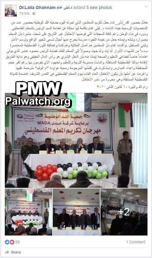 Posted text: "During a ceremony honoring the teachers, which was held today [Jan. 10, 2017] by The National Al-Lud Association in the presence of a number of official figures, [District Governor of Ramallah and El-Bireh] Dr. Laila Ghannam praised the Palestinian teacher and his role in building the homeland despite all of the obstacles that the occupation has placed before our people throughout history, in a speech she gave as the representative of His Honor [PA] President [Mahmoud Abbas]. She noted that the teacher, in his determination, stability, and belief, has turned the refugee tent into a school out of which generations have come who strive to change the reality, outline the hope, and build the future. Ghannam emphasized that the teachers are the essence of the story, and they are the leaders and giants of the modern Palestinian revolution, from the righteous Martyrs (Shahids) Abu Iyad (i.e., Fatah founder and head of the Black September terrorist organization) and Abu Jihad (i.e., Fatah founder and terrorist responsible for murder of 125), and until the teacher, the leader, His Honor President Mahmoud Abbas, who gives special attention to the fields of education and health out of his belief that human intelligence is the real capital, and the beginning of the path to the establishment of our independent Palestinian state."