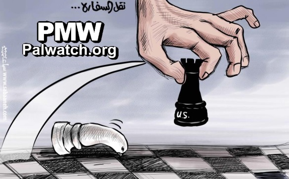 The cartoon shows a hand moving a black rook with “US” written on it across a chess board to checkmate a chess piece in the shape of a white dove, which has fallen over. The cartoon refers to US President-elect Donald Trump’s promise to transfer the US embassy from Tel Aviv to Jerusalem, symbolized by the rook’s move, and threatens that such a move would end the peace process, symbolized by the fallen dove.