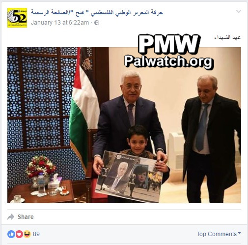 The image shows PA Chairman Mahmoud Abbas, together with a boy, holding a picture from a Fatah rally which shows a poster of Abbas and a poster of terrorist Dalal Mughrabi, who led the murder of 37 civilians, including 12 children.