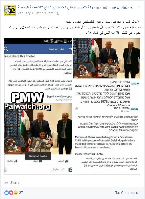 [PA Chairman] Mahmoud Abbas gave a Palestinian boy a picture of him and of terrorist Dalal Mughrabi who carried out a large terror attack in 1978 on the Coastal Road in which 35 Israelis (sic., 37) were murdered.”