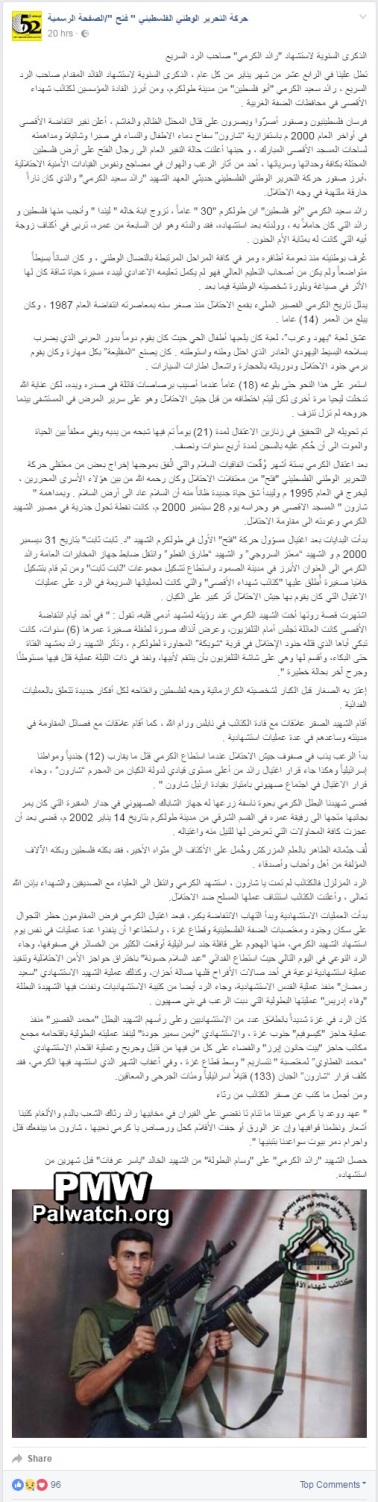 Posted text: “The anniversary of the death as a Martyr (Shahid) of quick-responding Raed Al-Karmi