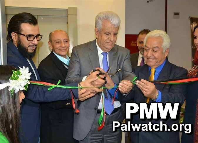The picture shows PA Ambassador to Egypt Jamal Al-Shubaki (center) cutting the ribbon on the exhibition.
