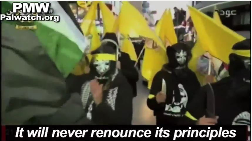 "We must send our blessings to the souls of our Martyrs who followed the path of freedom and with their pure bodies created bridges upon which we cross toward free and independent Palestine, whose capital is Jerusalem. Today we remember the leading Martyrs. We remember these great leaders and repeat our promise to be loyal to their memory and the memory of all of the Martyrs of Palestine and the Martyrs of the Arab nation. We will continue to follow their path, the path of the struggle and the revolution. We will never renounce the principles for which they died as Martyrs." (emphasis added)