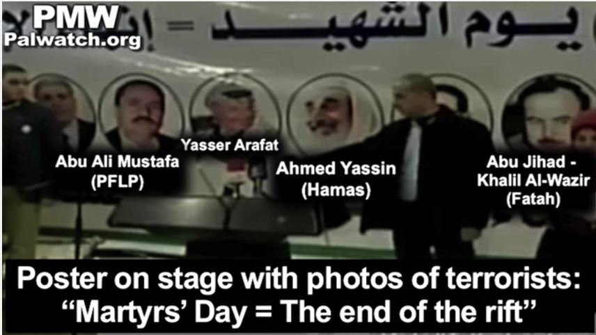 Poster on stage with photos of terrorists: "Martyrs' Day = The end of the rift:" Yasser Arafat, Ahmed Yassin (Hamas), Abu Ali Mustafa (PFLP), Abu Jihad - Khalil Al-Wazir (Fatah)