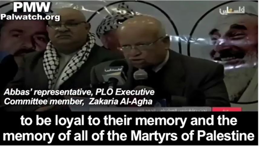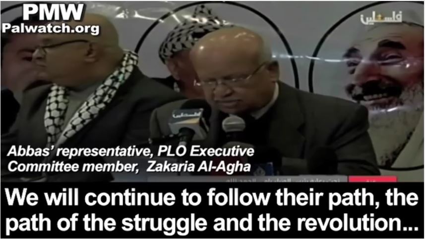 At the backdrop of the photos of these arch-terrorists, Abbas' representative, PLO Executive Committee member, Zakaria Al-Agha, glorified all "Martyrs" who used "their pure bodies" to "create bridges" for the Palestinians and vowed to continue on that same path: