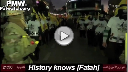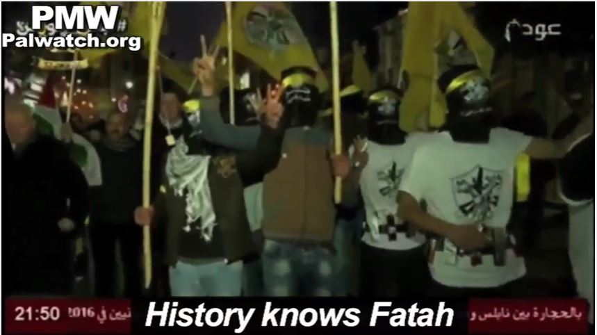 Promoting suicide terror is a recurring Fatah parade theme. Last year at the 51st anniversary celebrations it was children who Fatah had march through the streets of Bethlehem wearing black masks and mock suicide belts. [Ma’an, independent Palestinian news agency, Jan. 7, 2016]