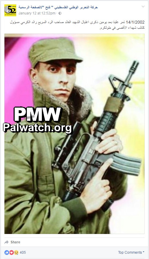 Celebrating the anniversary of the death of this "heroic Martyr," Fatah honored terrorist Raed Al-Karmi earlier this month on Facebook, posting photos of him posing with automatic weapons and praising him as "the settler hunter," "the quick-responding heroic commander," and "the falcon of the Al-Aqsa Martyrs' Brigades." [Official Fatah Facebook page, Jan. 12, 2017]