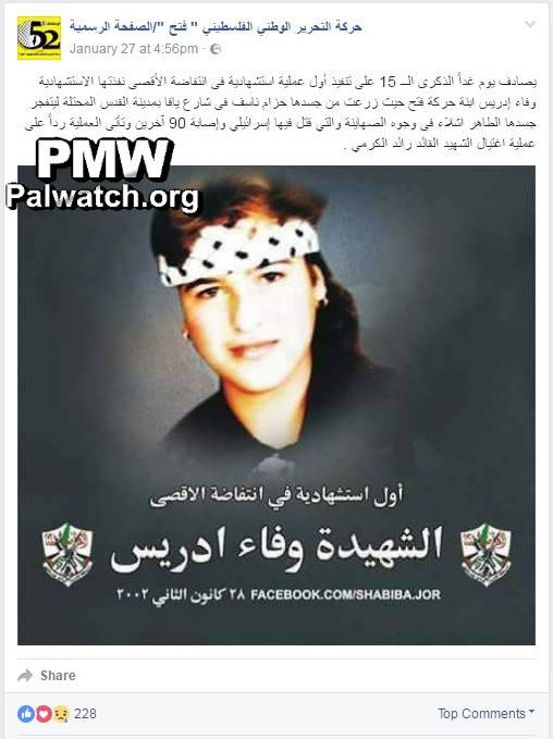Posted text: "Today [Jan. 27, 2017] is the 15th anniversary of the first Martyrdom-seeking operation of the Al-Aqsa Intifada (i.e., PA terror campaign 2000-2005), which was carried out by a female Martyrdom-seeker Wafa Idris, a daughter of the Fatah Movement. She planted an explosive belt on her body on Jaffa Street in occupied Jerusalem, so that her pure body would explode into pieces in the Zionists' faces. One Israeli was killed in the operation and an additional 90 were wounded (sic., over 100), and it came in response to the assassination operation against commander Raed Al-Karmi (i.e., terrorist, responsible for murder of 9)."