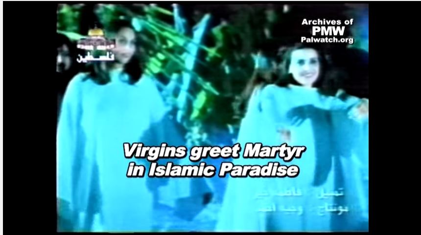 For example, one video that was the longest running music video on official Palestinian Authority TV encouraged Palestinian men to seek death as a Martyr in violent confrontation with Israel, through an actor portraying a "Martyr" being greeted by the beautiful virgins in Paradise. It first appeared on PA TV in 2000, was broadcast regularly during the terror campaign and ran sporadically through 2010.