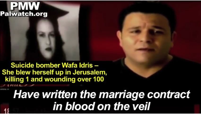 Encouraging suicide bombings and describing Martyrdom-death as a wedding in "Paradise of immortals" and the video's linking suicide bombers with "grooms and brides" who "have written the marriage contract in blood on the veil" were recurring messages during that terror campaign. The language and visuals of this clip are very reminiscent of PA TV clips during the Second Intifada as documented by Palestinian Media Watch.