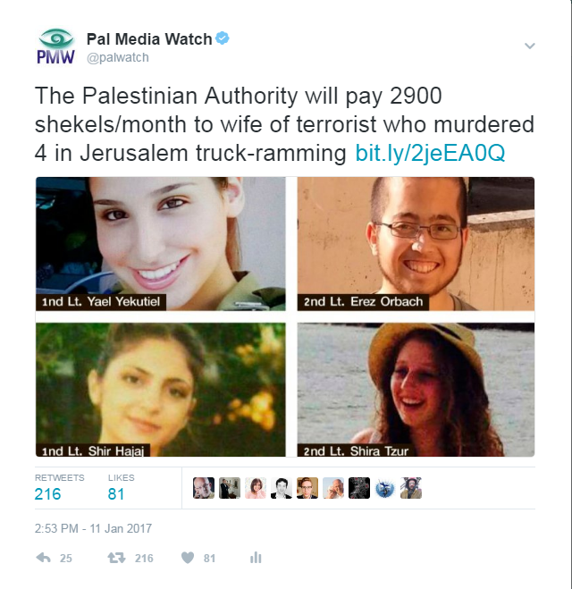 The PA devotes 486 million shekels ($127 million) of its annual budget to paying salaries to terrorists. An additional 660 million shekels ($174 million) of the PA’s annual budget is earmarked for paying allowances to the families of those “Martyred” or wounded in the act of "resisting" Israel. PMW reported last month that the family of the terrorist who murdered 4 Israelis in a truck ramming attack in Jerusalem would receive a 6,000 shekel grant as well as a monthly allowance of 2,900 shekels ($760).