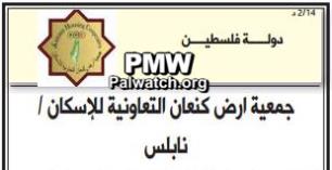 In the upper left hand corner of the tender appears the logo of the company, at the center of which is the PA map of “Palestine” that presents all of Israel as “Palestine” together with the PA areas. At the top is the name of the company written in English: “Kanaan Housing Corporation KHC,” and at the bottom is the name in Arabic.