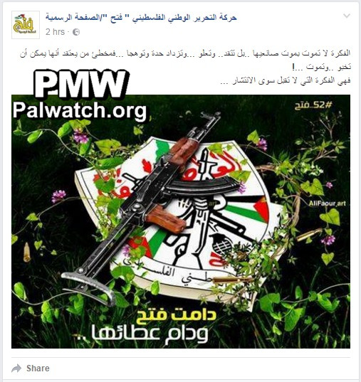 The picture shows an AK-47 assault rifle laid over the Fatah logo that includes a grenade, crossed rifles, and the PA map of “Palestine” that presents all of Israel as “Palestine” together with the PA areas.