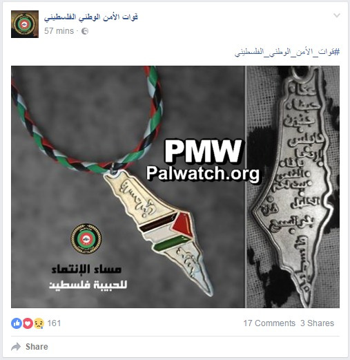 The picture on the left shows a pendant in the shape of the PA map of “Palestine” that presents all of Israel as “Palestine” together with the PA areas, and on the map appears a Palestinian flag along with the word: “Palestine is Arab.” On the picture appears the PA National Security Forces symbol.