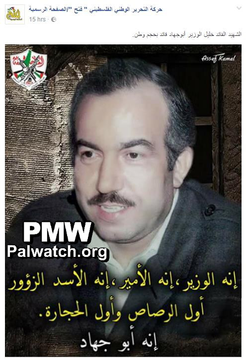 Posted text: “Martyr (Shahid) leader Khalil Al-Wazir Abu Jihad (i.e., former head of the PLO terror organization’s military wing) – a leader whose greatness was as the greatness of the homeland”