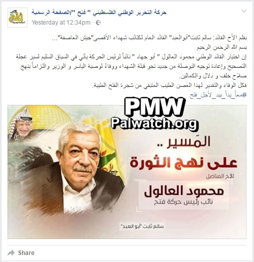 Fatah also used its Facebook page to present its recent choice of Mahmoud Al-Aloul as Deputy Chairman of the Fatah Movement as part of Fatah’s “process of correction and the redirecting of the compass towards the Martyrs,” and a “commitment to the path” of two terrorist murderers: Salah Khalaf - former head of the terror organization Black September and planner of the murder of 11 Israeli athletes at the Munich Olympics, and Dalal Mughrabi - who led the murder of 37. (See full text below.)