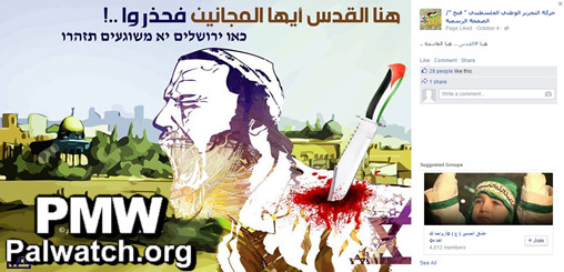 Fatah posted an image encouraging stabbing Jews on its Facebook page, at the beginning of the 2015-2016 terror wave. The image depicts a religious Jew screaming in pain with a knife stuck in his shoulder, accompanied by the text: "Here is Jerusalem, you crazies, beware!" [Official Fatah Facebook page, Oct. 4, 2015]