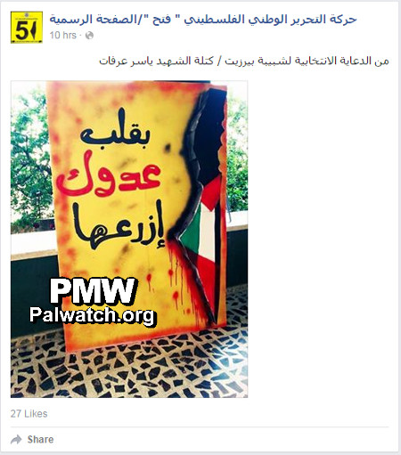 Text on poster: "Plant it [the knife] in the heart of your enemy." [Official Fatah Facebook page, Apr. 26, 2016]