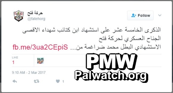 Text tweeted from the official Fatah Twitter account“The 15th anniversary of the death as a Martyr (Shahid) of heroic Martyrdom (Shahada) seeker Muhammad Daraghmeh (i.e., suicide bomber, murdered 11), an activist of the Al-Aqsa Martyrs’ Brigades, Fatah's military wing”
