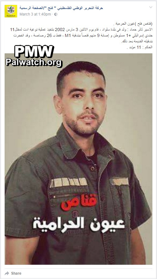 Prisoner Thaer Hammad: born in the village of Silwad. On Monday, March 3, 2002, he carried out a quality operation (i.e., terror attack) that led to the death of 11 Israeli soldiers and 1 settler (sic., he murdered 3 civilians and 7 soldiers) and the wounding of 9, while using an M1 rifle and just 26 bullets. The old rifle blew up immediately afterwards.