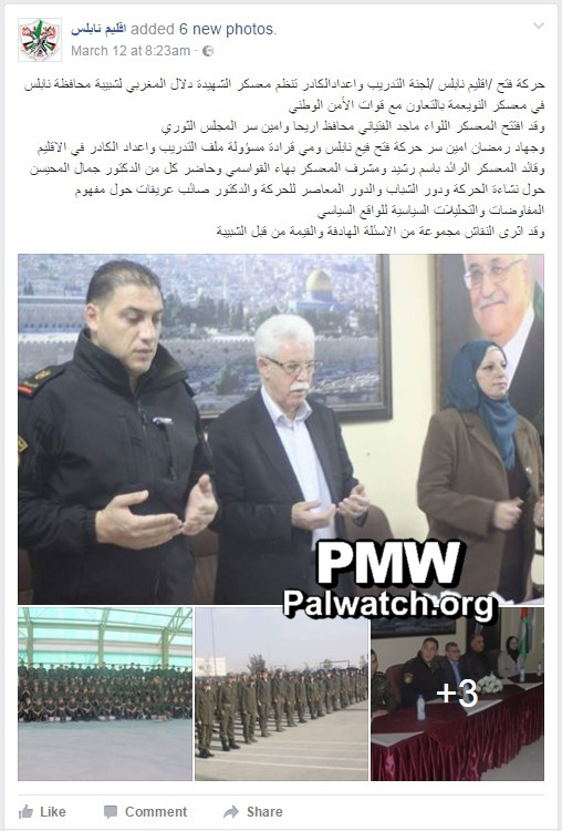 Images and text posted on the Facebook page of Fatah’s Nablus branchPosted text: “The Training and Staff Preparation Committee of the Fatah Movement’s Nablus branch organized the Martyr (Shahida) Dalal Mughrabi Camp (i.e., terrorist who led murder of 37, 12 of them children) for the Shabiba (i.e., the Fatah youth movement) of the Nablus district at the Al-Nu’eima camp, in partnership with the [PA] National Security Forces.