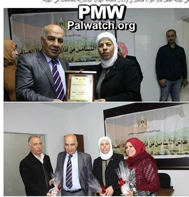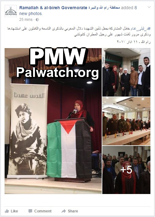 A PA official, District Governor of Ramallah and El-Bireh Dr. Laila Ghannam, likewise spoke at the ”eulogy ceremony for Martyr Dalal Mughrabi.” [Official Facebook page of Ramallah & Al-Bireh Governorate, March 11, 2017]