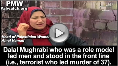 Head of Palestinian Women’s Union Amal Hamad: "Dalal Mughrabi who was a role model led men and stood in the front line (i.e., terrorist who led murder of 37). Dalal established a state inside a bus, and waved a flag over the bus. She killed as many as she killed from among the occupation’s soldiers, not from among civilians (sic., all of the victims were civilians). She excelled in her leadership, her pioneering and her faith."