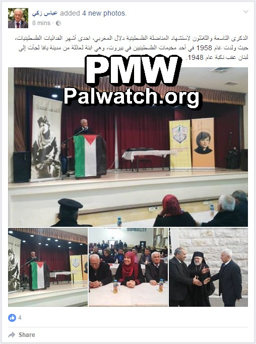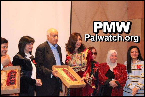 Posted text: “[District Governor of Ramallah and El-Bireh] Dr. Laila Ghannam during her participation in the eulogy ceremony for Martyr (Shahida) Dalal Mughrabi (i.e., terrorist who led murder of 37, 12 of them children) on the 39th memorial day of her death as a Martyr, and for the passage of three months since the passing of [former Greek Catholic] Archbishop [of Jerusalem Hilarion] Capucci