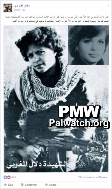 Fatah Central Committee member Tawfiq Tirawi presented Mughrabi as an example to follow, “a school”, praised her for “scattering her soul on the soil,” and posted a photo of her holding an assault rifle: