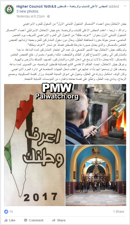Posted text: “The occupation army prevented members of the first Wandering Youth Camp from entering the Ibrahimi Mosque (i.e., the Cave of the Patriarchs)