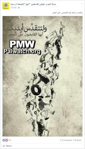 The image shows masked Palestinian rioters throwing rocks, rolling tires, and waving flags. The rioters are presented in such a way that they form the PA map of “Palestine” that presents all of Israel as “Palestine” together with the PA areas.