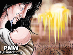 The cartoon shows a woman holding a baby and crying. Her tears form the shape of the PA map of “Palestine” that presents all of Israel as “Palestine” together with the PA areas, before dripping into the baby’s mouth.