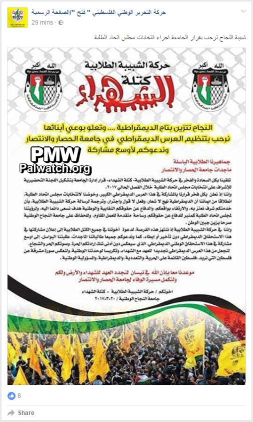 The logo of An-Najah National University also recently appeared on Fatah's official Facebook page in an announcement (right) publicizing the upcoming elections for the student union council.