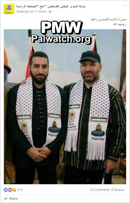 Posted text: "A keepsake picture of [Ahmed] Al-Ja'abari (i.e., former commander of Hamas’ military wing) and [Mazen] Fuqaha (i.e., terrorist, planned suicide bombing)