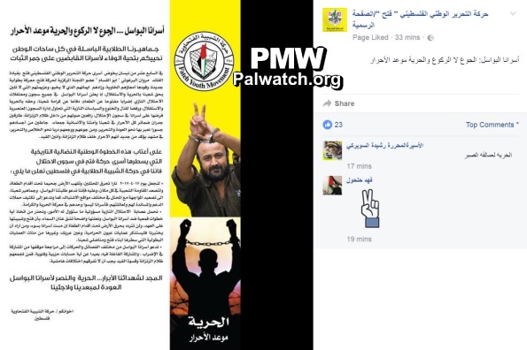 Text on image: “On April 17, [2017,] prisoners of the Palestinian National Liberation Movement Fatah led by Fatah Movement Central Committee member, leader Marwan Barghouti ‘Abu Al-Qassam’ (i.e., terrorist who orchestrated three shooting attacks in which 5 were murdered) will launch a new heroic campaign, whose fuel is their empty stomachs…