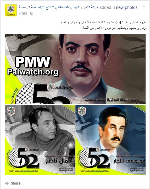 Posted text: “Today is the 44th anniversary of the deaths as Martyrs (Shahids) of the three commanders [Abu Yusuf] Al-Najjar (i.e., former commander of Black September terror organization), [Kamal] Adwan (i.e., senior Black September member), and [Kamal] Nasser (i.e., senior Black September member)