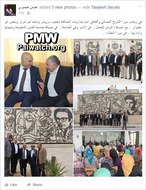 Posted text: “The history of the struggle and culture throughout Dura, in front of the wall reliefs of the giants Mahmoud Darwish (i.e., Palestinian poet), Majed Abu Sharar (i.e., senior Fatah and PLO leader from the 1970s), and Bajes Abu Atwan (i.e., Fatah terrorist killed while fighting against Israel in 1974), with friends from the good times in prison and university, hosted by Al-Quds Open University, its [Fatah student movement] Shabiba, and its administration.”
