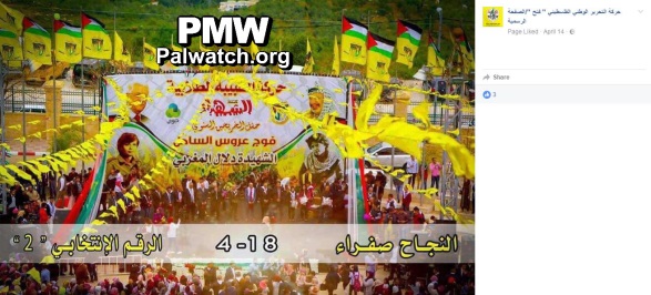 The image shows an event with Fatah flags and a stage backed by a large poster featuring pictures of PA Chairman Mahmoud Abbas, Yasser Arafat, and two pictures of Dalal Mughrabi, a terrorist who led the murder of 37, 12 of them children. Next to the picture of Yasser Arafat is the logo of Fatah’s student movement Shabiba at An-Najah National University. The logo consists of a coat of arms featuring on its left a raised fist in the shape of the PA map of “Palestine” that presents all of Israel as “Palestine” together with the PA areas. The symbol also features an image of the Dome of the Rock and the keffiyeh (Arab headdress) pattern.