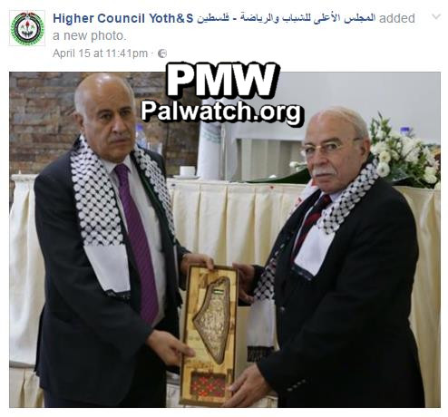 The image shows Fatah Central Committee Secretary and Head of the PLO Supreme Council for Sport and Youth Affairs Jibril Rajoub standing with an unidentified man. The two are holding a plaque between them featuring the PA map of “Palestine” that presents all of Israel as “Palestine” together with the PA areas.