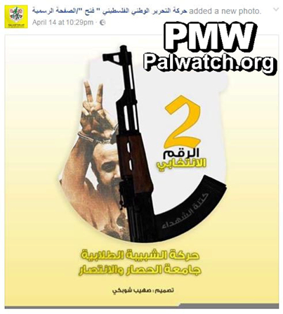 Fatah's Shabiba student movement created a poster for the elections at An-Najah University, which shows a rifle and a picture of Marwan Barghouti making the "V" for victory with his handcuffed hands. Text to right of rifle: "2 - the number [to vote for Fatah] in the elections"