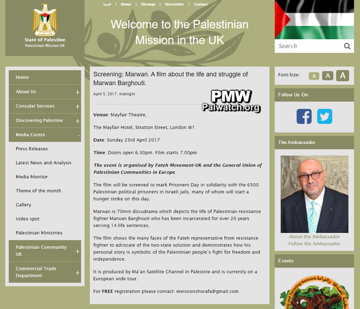 Yesterday, Palestinian Media Watch exposed that the Palestinian Mission in the UK was involved in the screening of a film honoring imprisoned terrorist Marwan Barghouti, which was to take place next week at the Mayfair Hotel in London. Within hours after PMW released the story, the hotel announced that the event was canceled due to "standard due diligence" undertaken by the hotel: