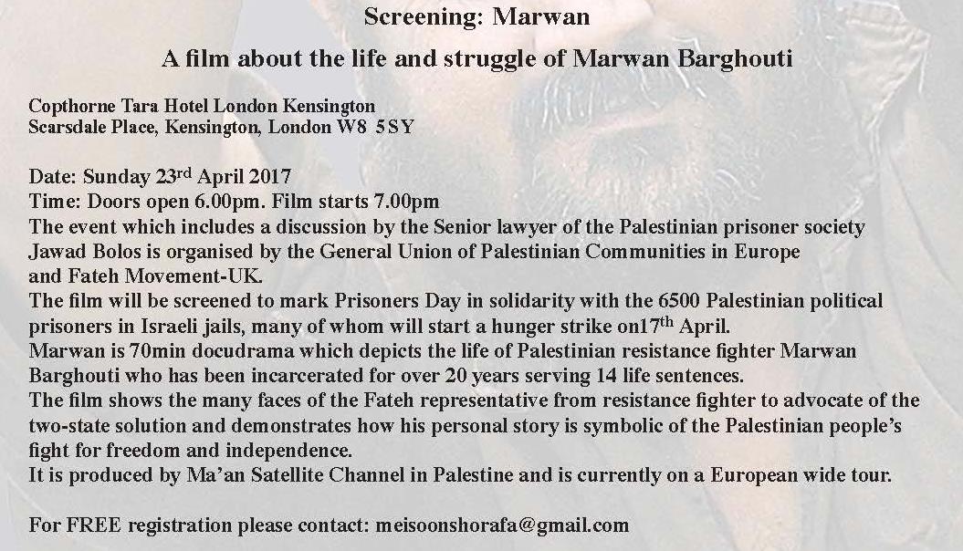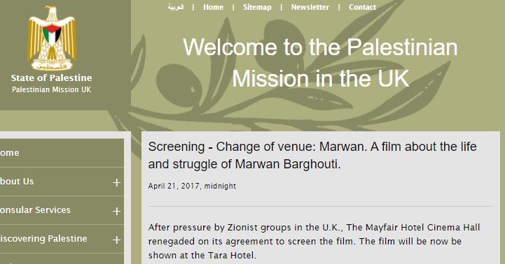 Last week, Palestinian Media Watch reported that the Palestinian mission in Britain was planning to screen a film about terrorist Marwan Barghouti at the Mayfair Hotel in London. Following PMW’s exposure, the hotel cancelled the event.