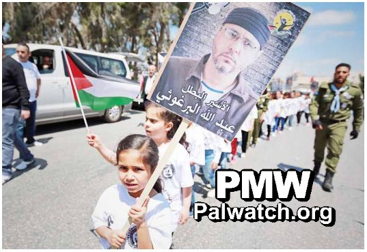 The article includes a picture from the procession, in which a young girl scout is seen holding a sign featuring a picture of terrorist Abdallah Barghouti, who prepared explosives for terror attacks in which 67 people were murdered.