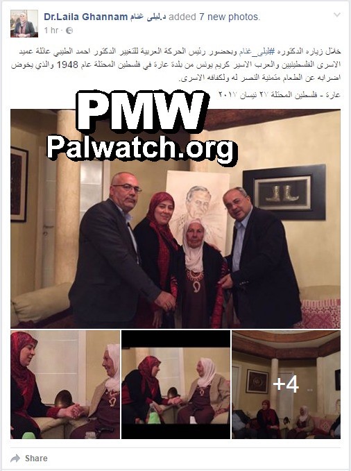Posted text: “During [Governor of Ramallah and El-Bireh] Dr. Laila Ghannam’s visit, in the presence of Raam party Chairman [Israeli Arab Parliament member] Dr. Ahmad Tibi, with the family of the oldest of the Palestinian and Arab prisoners, prisoner Karim Younes (i.e., terrorist, murdered 1), from the village of ‘Ara in Palestine that was occupied in 1948 (i.e., Israel). Ghannam wished Younes and all of the prisoners success in the hunger strike that they are waging.