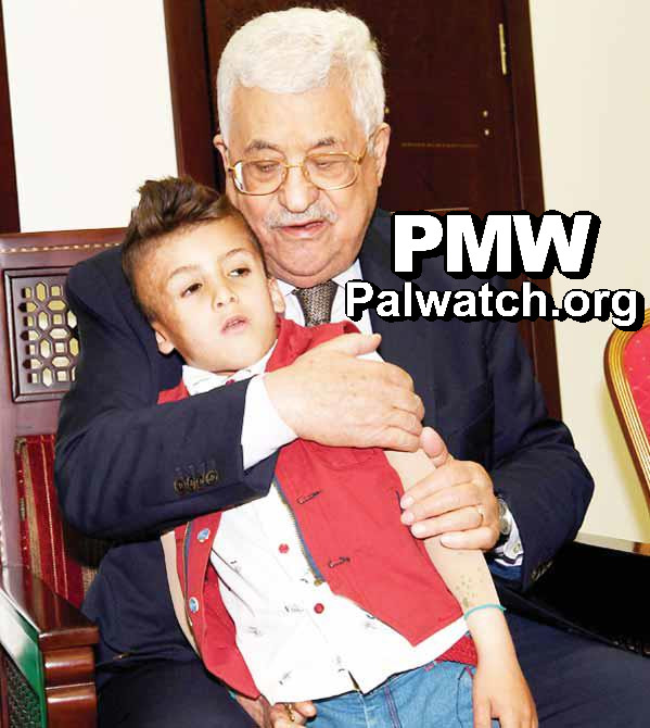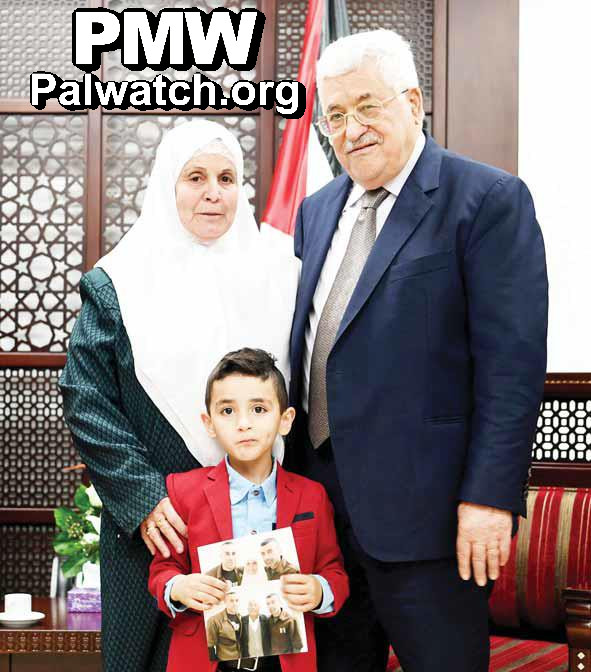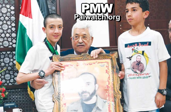 The first picture shows PA Chairman Mahmoud Abbas holding a picture of prisoner Khaled Khdeish, a terrorist who was involved in the murder of 2. Abbas is accompanied by two boys, apparently Khdeish’s sons.